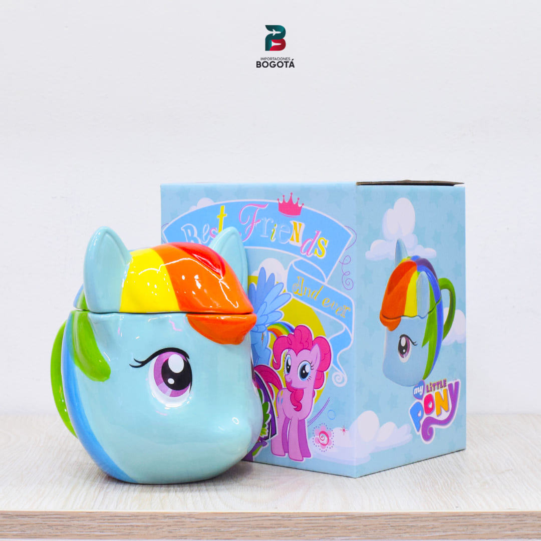 Taza Rainbow Dash 3D en cerámica esmaltada con tapa decorativa y diseño tridimensional del personaje más enérgico de My Little Pony. Capacidad de 400 ml, ideal para coleccionistas y amantes del color.
