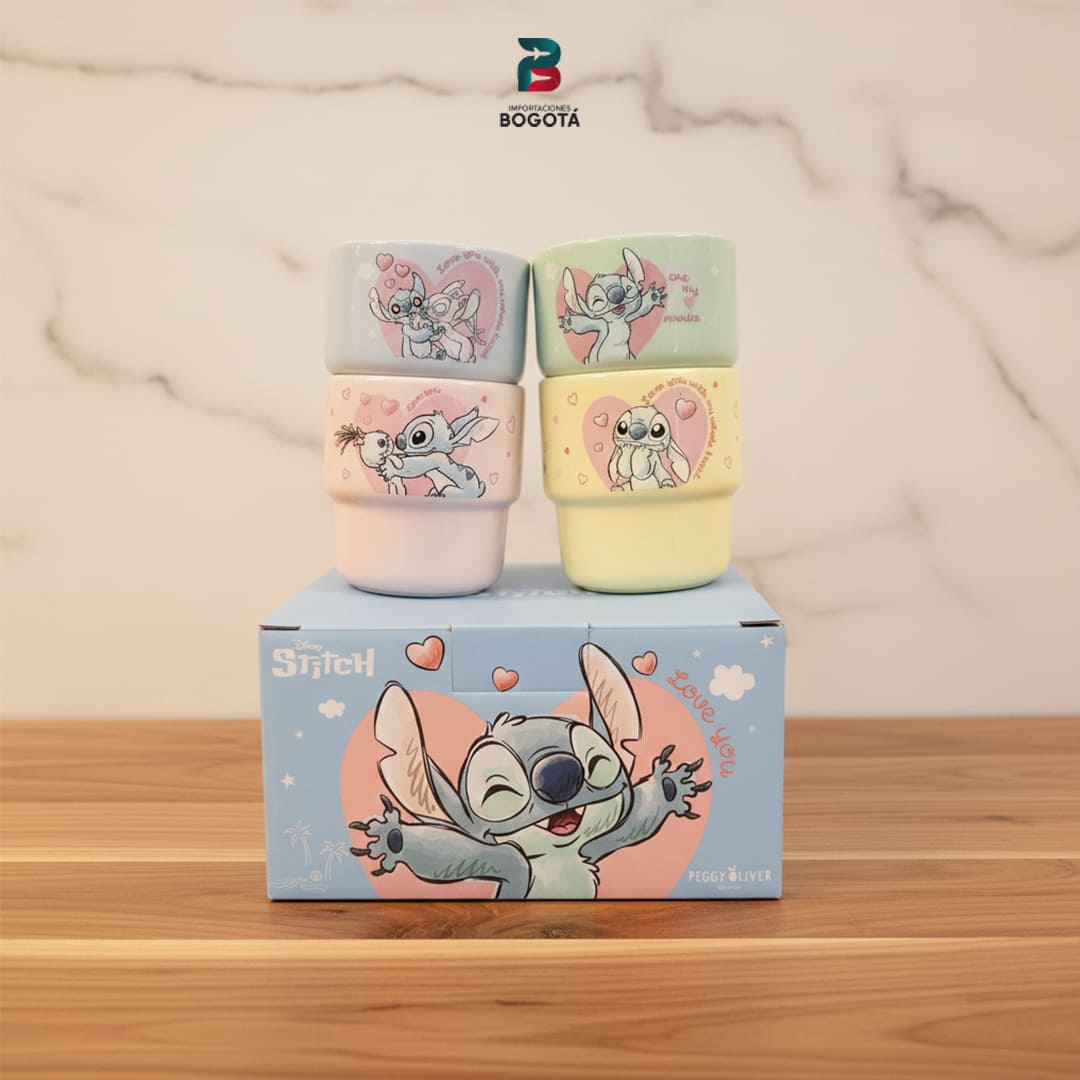 4 tazas pequeñas apilables con diseños de Stitch. Colores pastel. ¡Ideal para coleccionar o regalar! 🛍️ ¿Cuál es tu diseño favorito?